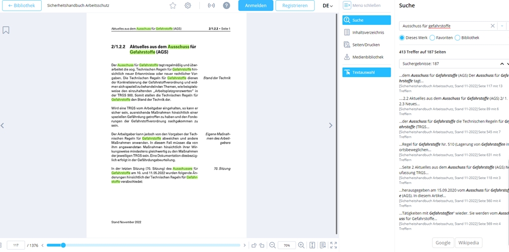 Die Online-Ausgabe bietet als Zusatzfunktionen den mobilen Abruf per App, die schnelle Navigation durch direkt verlinkte Inhaltsverzeichnisse und Verweise, eine Volltext-Suche sowie das komfortable Hinzufügen und Bearbeiten von Lesezeichen und Notizen als Bild, Text oder Sprachnachricht.
