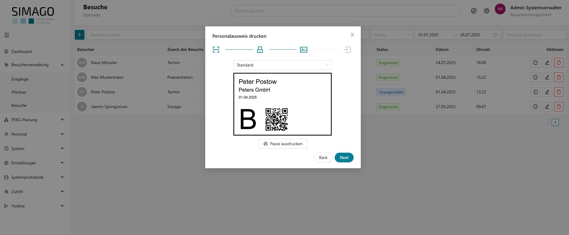 - Ausweisdruck und ggf. Kodierung von Besucherausweisen