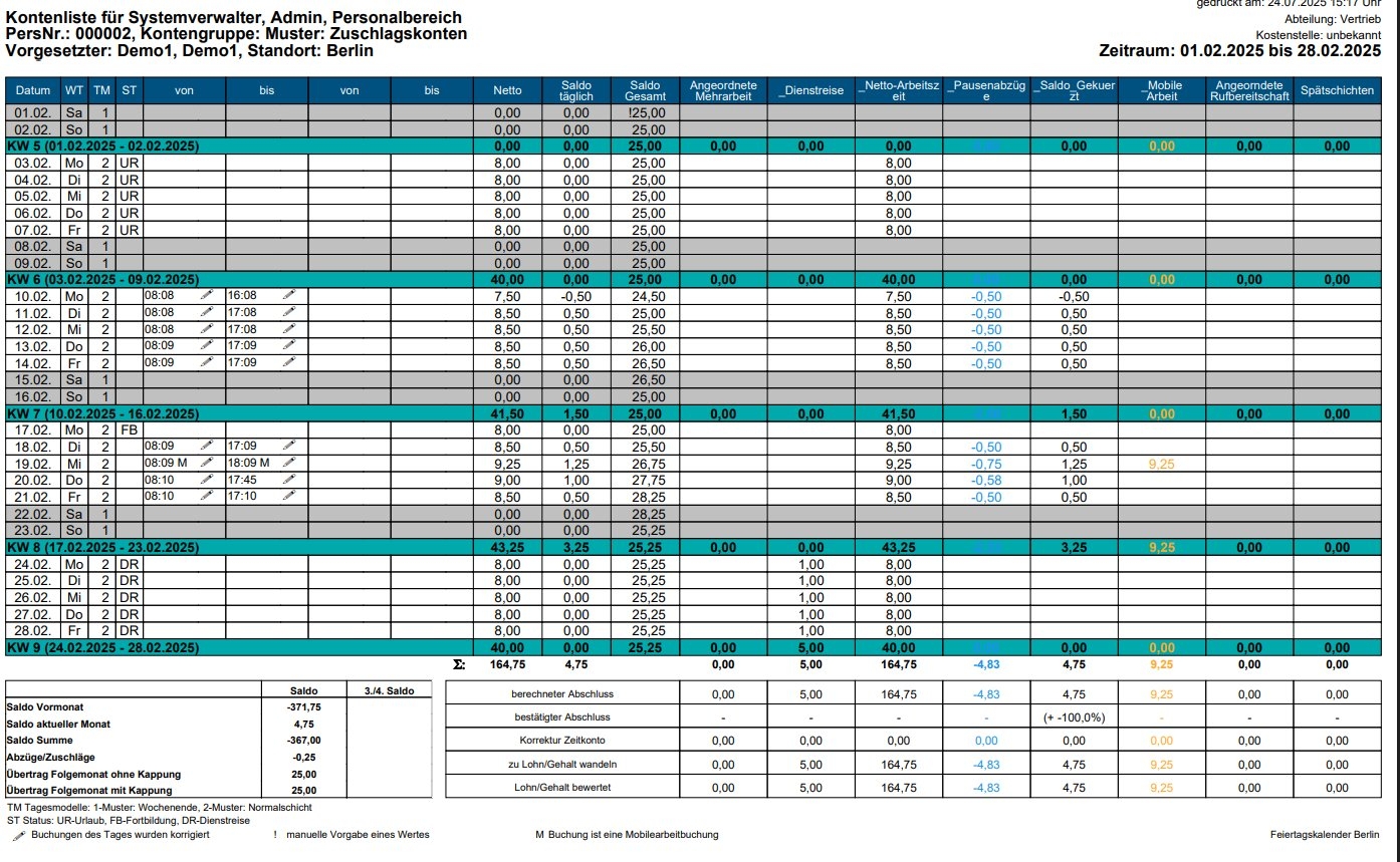 - Flexible Arbeitszeitregelungen, Berücksichtigung von Pausen, Urlaub, Krankheit, Dienstreise, Zeitsaldo