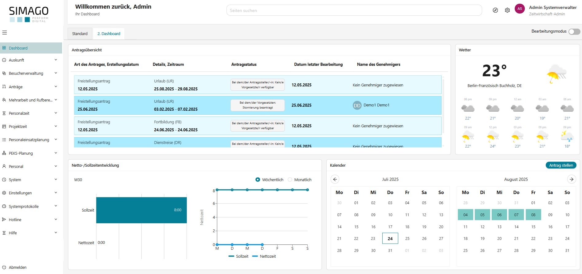 Simago® time unterstützt Sie beim Management der Mitarbeiterstammdaten, bei der Verwaltung von Tagesmodellen, Arbeitsplänen und der Auswertung der Zeitbuchungen. Die Zeiterfassungs-Lösung von Simago® time bietet Employee Self Service, mit der Ihre Mitarbeiter Workflows beispielsweise für Urlaub oder Dienstreisen nutzen können. Diese Anwendung verkürzt die Laufzeiten und schafft mehr Transparenz für alle Beteiligten.