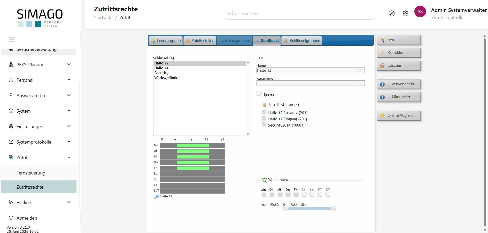 Die Simago® access – Zutrittskontrolle bietet umfassende Funktionen für die Verwaltung der Zutrittsberechtigungen und die Auswertung sämtlicher Zutrittsereignisse. Die browserbasierte Softwarelösung ist einfach zu handhaben. In nur wenigen Schritten können selbst umfangreiche Zutrittsprofile (Schlüssel-/Schlüsselgruppen sowie Raum-/Zeitzonen) selbst erstellt und den jeweiligen Mitarbeitern zugewiesen werden.