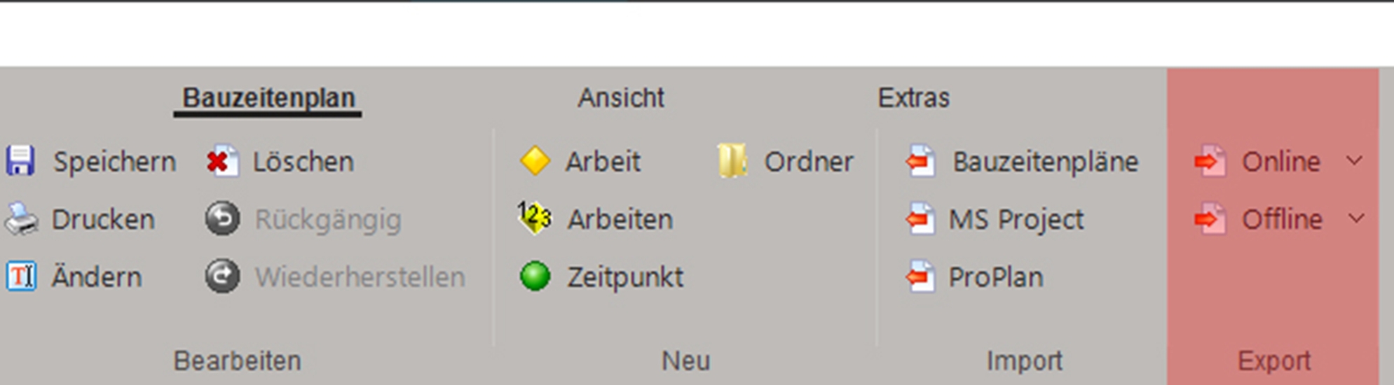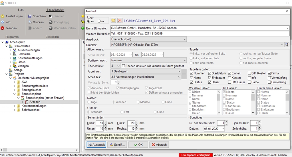 Die Bauzeitenpläne können entweder komplett und dann auch auf die Papiergröße eingestellt ausgedruckt werden oder nach unterschiedlichen Faktoren gefiltert werden. Möglichkeiten der Anpassung bei den Ausdrucken sind:
