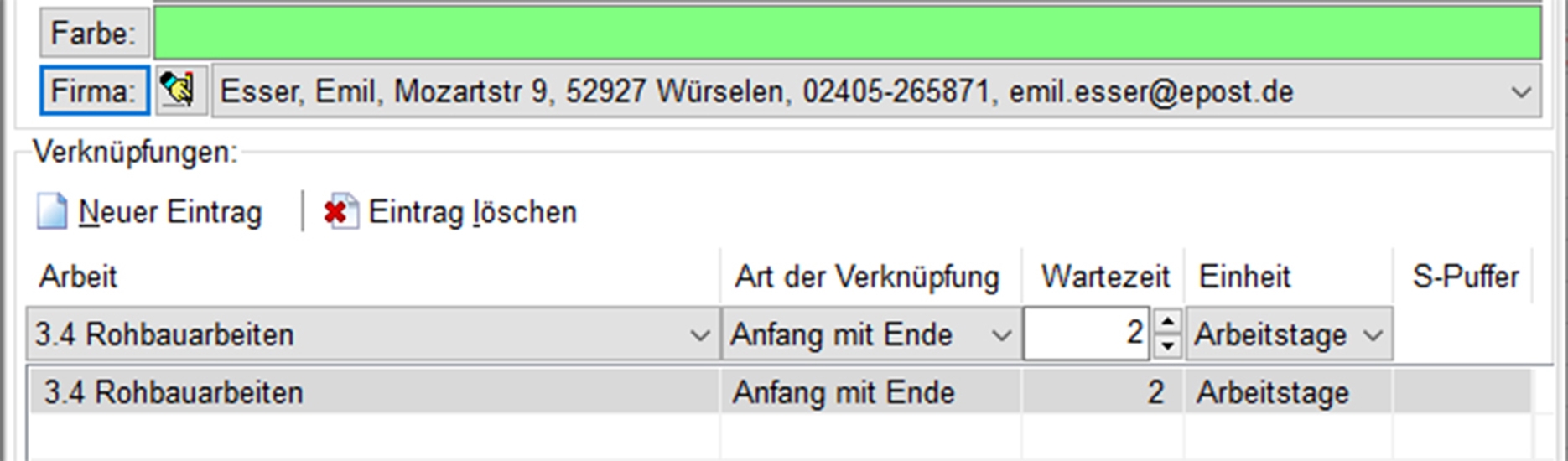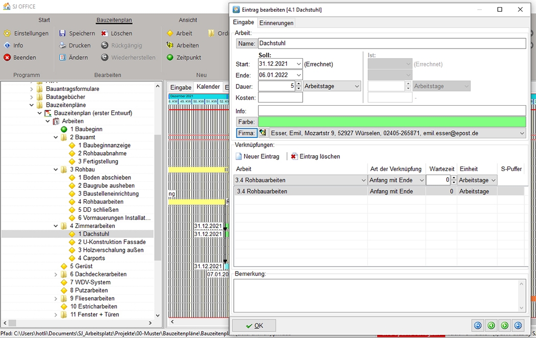 Arbeiten können zudem miteinander verknüpft werden. Die Auswahl der Verknüpfungen funktioniert über eine Auswahlliste. Folgende Verknüpfungsarbeiten sind möglich: Anfang-Ende, Anfang-Anfang, Ende-Anfang, Ende-Ende. Bei den Verknüpfungen werden Wartezeiten und Überschneidungen angezeigt, Sonn- und Feiertage sowie Urlaubszeiten der Mitarbeiter berücksichtigt und Pufferzeiten automatisch berechnet.