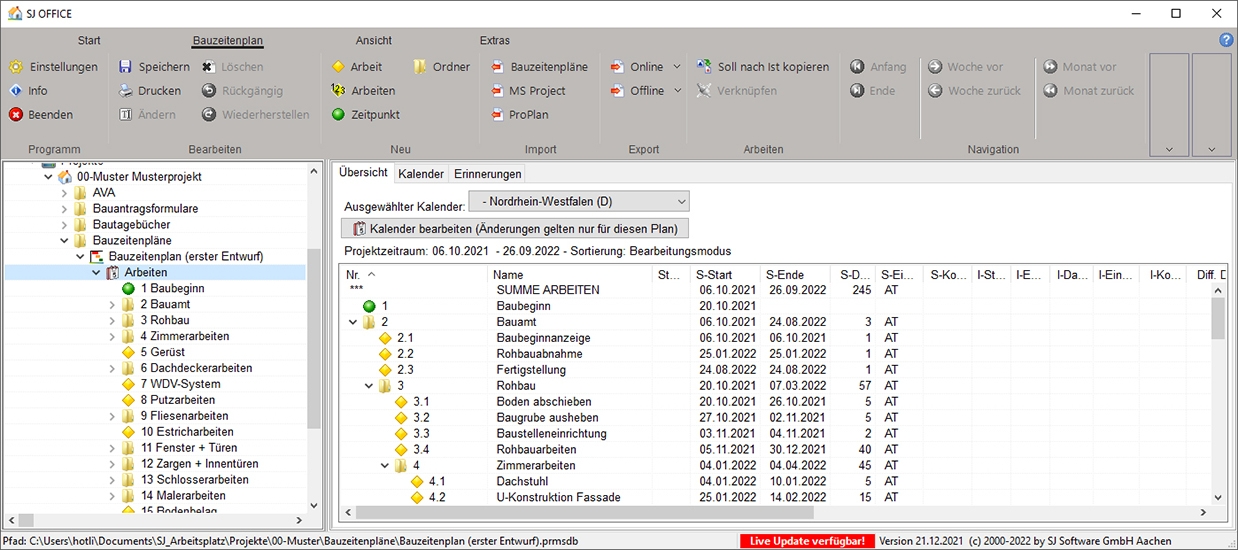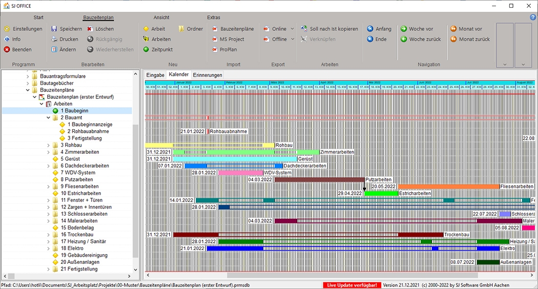 Die Software Bauzeitenpläne enthält alle wichtigen Funktionen für die Zeitplanung und ist dank Baumstruktur übersichtlich aufgebaut und leicht zu bedienen. Dank Übersichtsliste, Verknüpfungen und weiteren Features haben Nutzer immer einen guten Überblick und können Daten einfach eingeben oder pflegen. Beispielsweise können Ordner angelegt werden, um die Arbeiten systematisch zu unterteilen. Diese können dann auch per Drag & Drop verschoben oder kopiert werden. Das Programm ist seit 1990 im Einsatz.