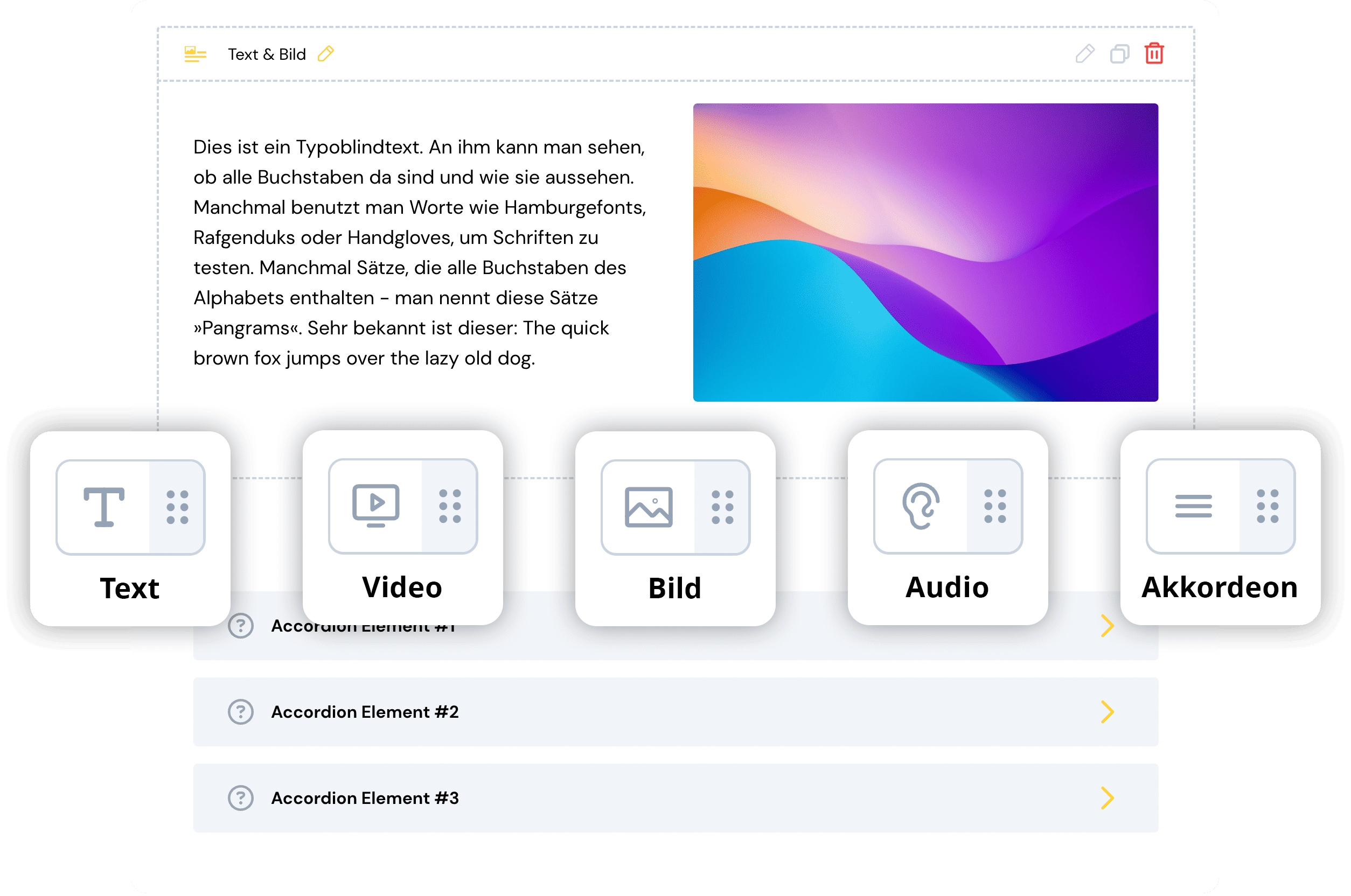 - Autorentool: Erstellen Sie eigene E-Learnings ohne Programmierkenntnisse, platzieren Sie Texte, Bilder, Videos, Audio oder iFrames per Drag-and-Drop und integrieren Sie Tests zur Wissensabfrage.