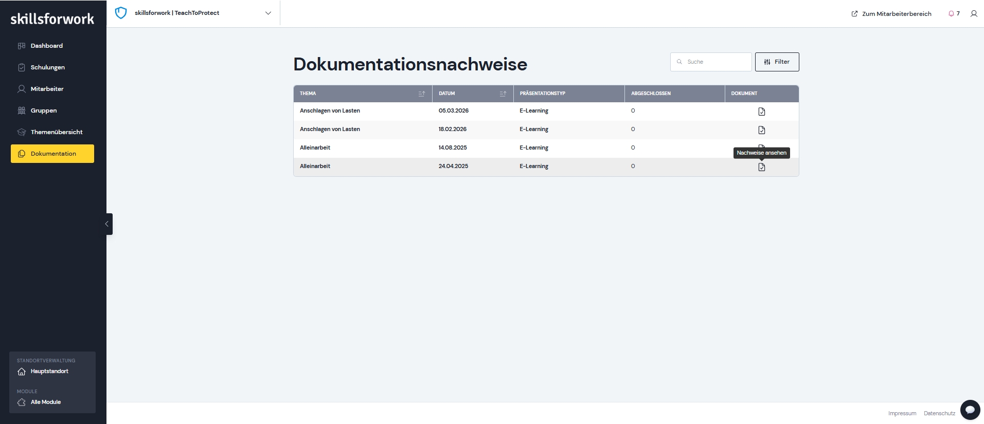 - Zentrale Dokumentation und Nachweisführung für rechtssichere Pflichtschulungen und Zertifikate.
