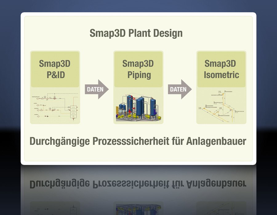 Die Kombination der drei Smap3D Plant Design-Module P&ID, Piping und Isometrie wird für eine durchgängige Prozesskette verwendet. Die Weitergabe von verfügbaren Informationen und Daten erfolgt über automatische Programmverbindungen, ohne die erneute Durchführung eines Exports oder Imports.