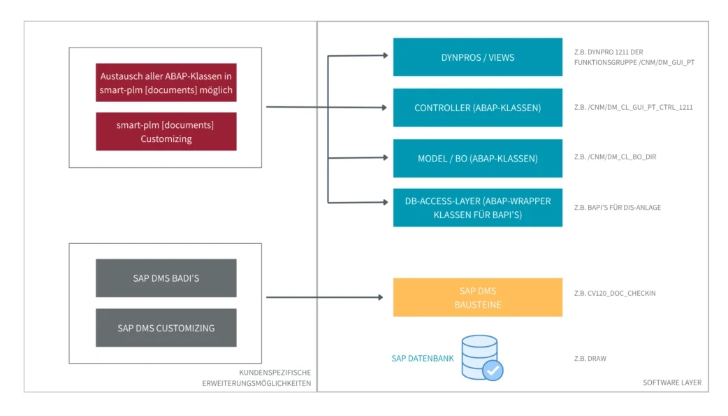smart plm documents basiert auf einer offenen ABAP Architektur und nutzt bewährte SAP Standardstrukturen wie Dokumenteninfosätze, Dokumentenstücklisten und Klassifizierungen. Die Lösung ist ab SAP Basis Release 7.40 bis zum aktuellen SAP S/4 HANA Release verfügbar und unterstützt sowohl On Premise Installationen als auch private Cloud Bereitstellungen.