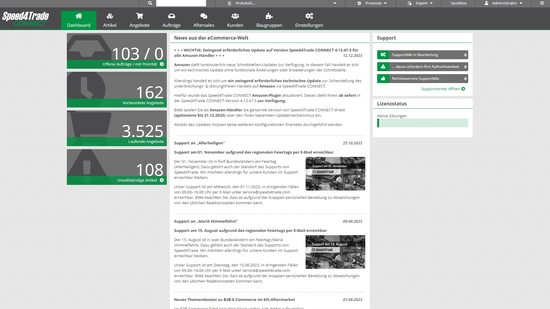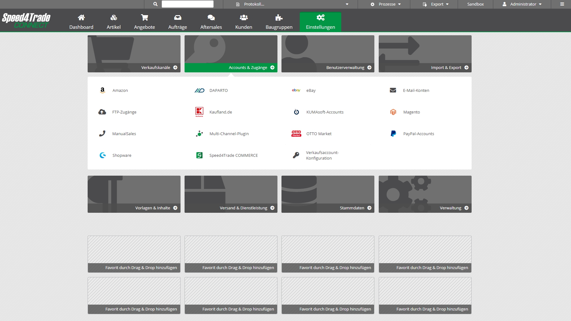Die Integrationsplattform Speed4Trade CONNECT bietet Schnittstellen zu den größten und bekanntesten Online-Marktplätzen der Welt. Händler und Hersteller profitieren von automatisierten Prozessen, wie dem Einstellen von Angeboten auf Marktplätzen. Durch effektives Produktlisting mit Speed4Trade CONNECT sind individuelle Absatzstrategien möglich. Mithilfe von Angebotsvorlagen, Bausteinen und Platzhaltern für ansprechende Angebote sowie dem Synchronisieren der Bestände wird der Verkauf erfolgreich geplant. Zudem steuert Speed4Trade CONNECT gezielt die Auftragsabwicklung und unterstützt die Kundenkommunikation und Aftersales-Prozesse. Das Ergebnis: ein ganzheitliches Multi-Channel-Komplettsystem nach dem Motto: Einfach und schnell im Online-Handel durchstarten.