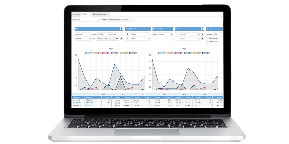 Umfangreiche Auswertungen, Statistiken und Berichte können individuell erstellt werden, von Teilnehmerlisten bis zu Kosten- und Erfolgsanalysen.