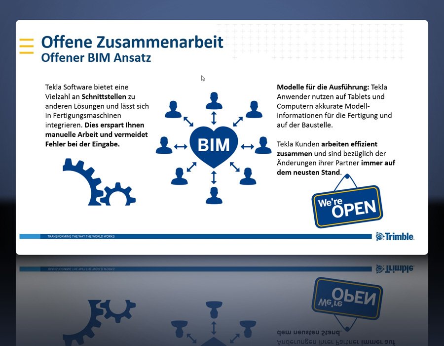 - Zusammenarbeit mit Auftraggeber, mit anderen Gewerken und mit dem Montageteam durch Trimble Connect, 3D PDF, Webmodelle usw.