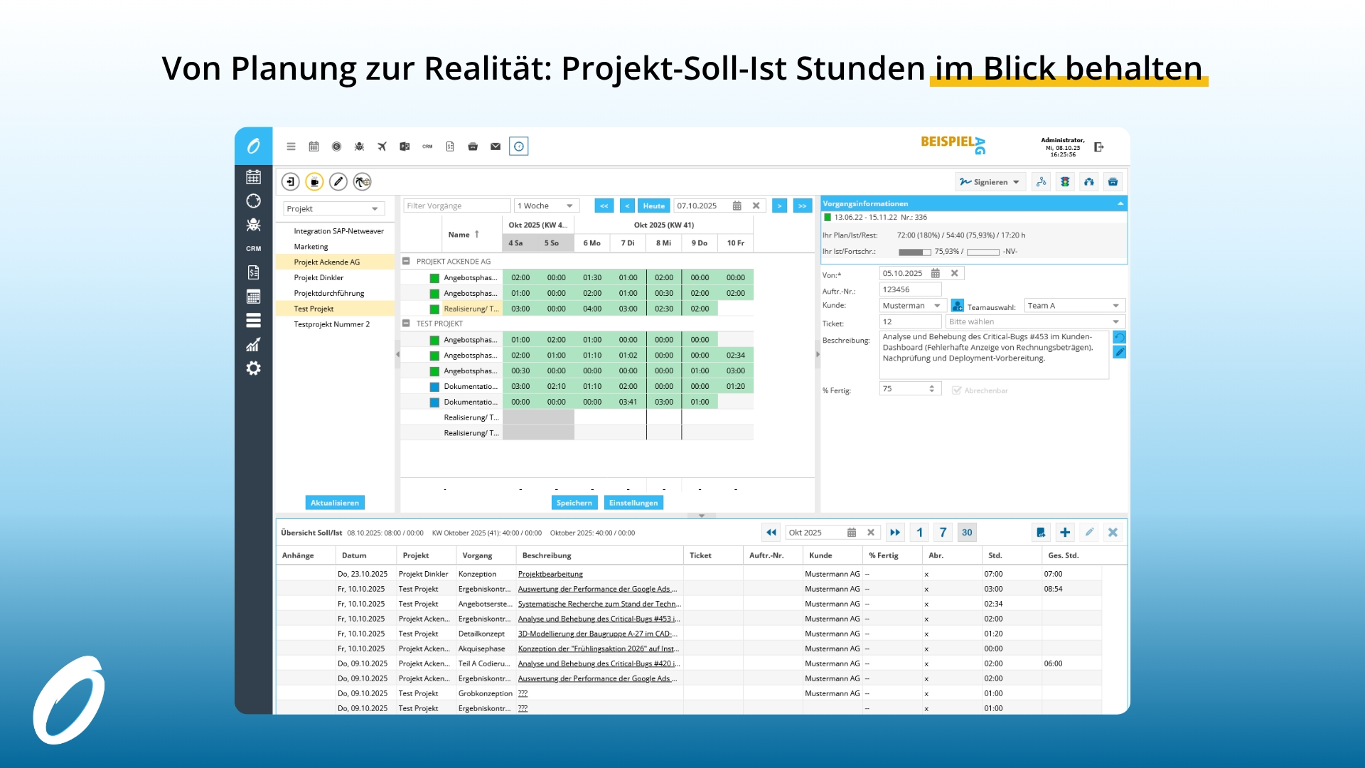 TimO digitalisiert und integriert zentrale Geschäftsprozesse – von der Zeiterfassung über die Projektplanung bis zur Abrechnung. So entfallen manuelle Arbeitsschritte, Systembrüche werden beseitigt und Führungskräfte erhalten in Echtzeit volle Transparenz über Ressourcen, Budgets und Projektfortschritt.