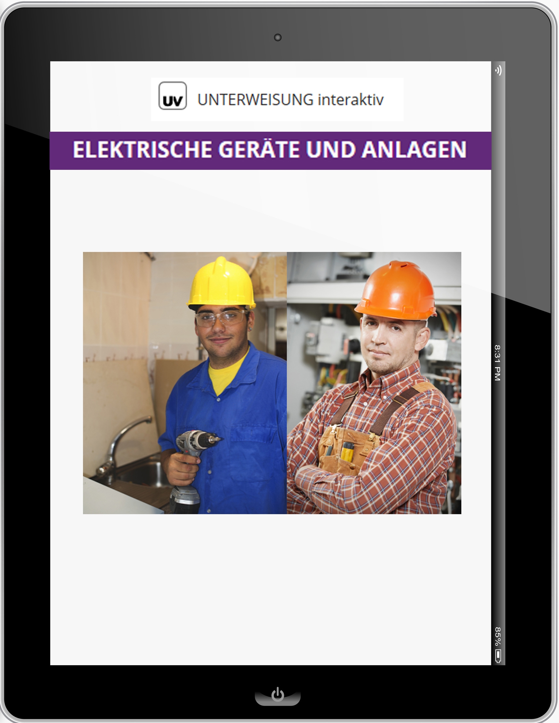 Elektrische Geräte sind heutzutage nicht mehr wegzudenken und der Umgang mit ihnen ist selbstverständlich. Leider ist das Wissen um die Risiken im Umgang mit Strom und elektrischen Geräten immer nicht vorhanden. Das interaktive Lernprogramm bietet in getrennten Unterweisungen für elektrotechnische Laien und Elektrofachkräfte Informationen um die Risiken bei der Arbeit mit elektrischem Strom. Physikalische Grundlagen werden äußerst anschaulich erklärt und konkrete Beispiele gezeigt.