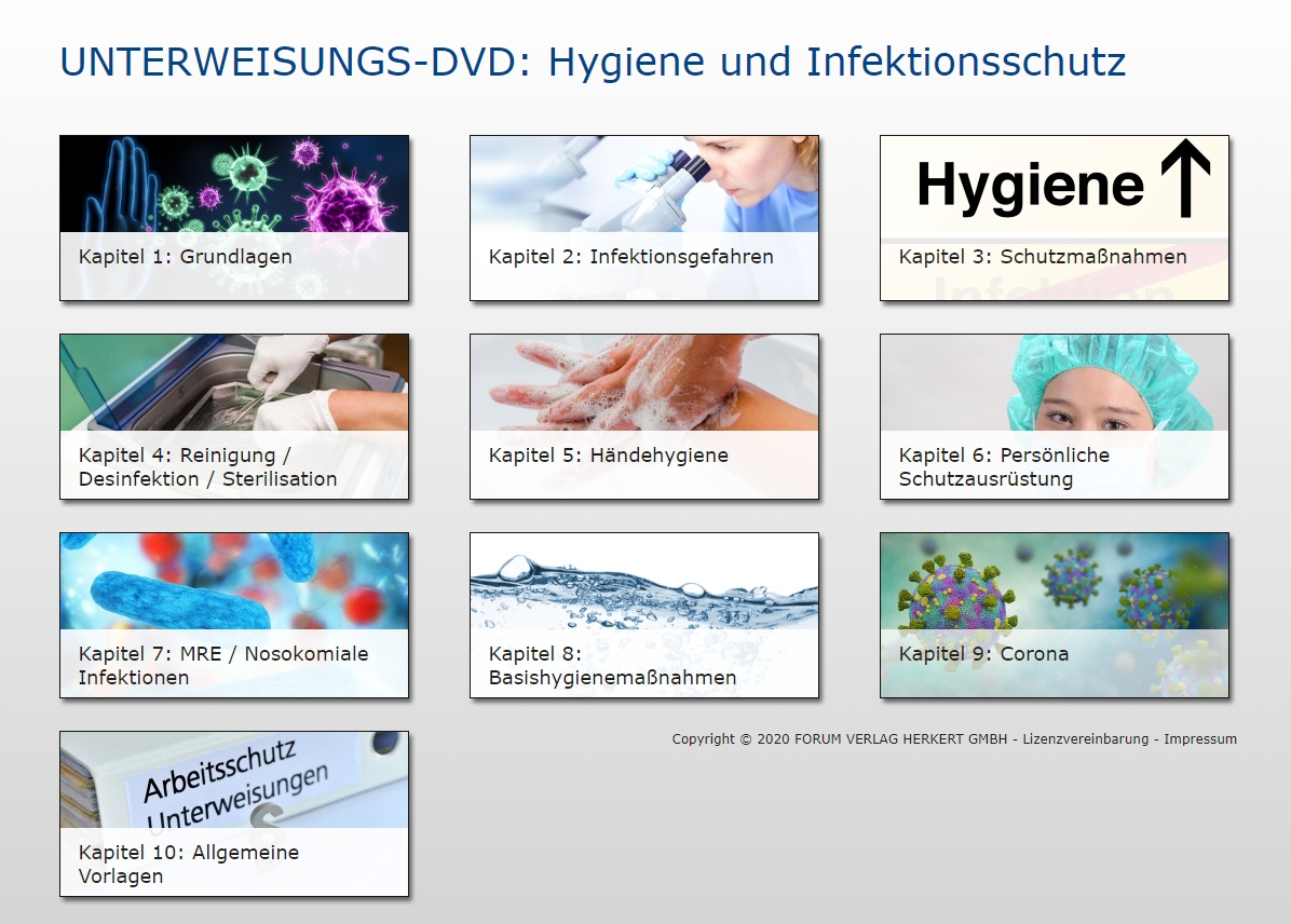 Zu den Schulungsinhalten gehören verschiedenen Schulungsfilme z.B. zu Schutzmaßnahmen, Händehygiene, Persönliche Schutzausrüstung und Basishygienemaßnahmen. Die DVD umfasst zahlreiche Arbeitshilfen wie Musterhygieneplan, Muster-Betriebsanweisung, Mitarbeitermerkblätter, Verfahrensanweisungen und Epidemiologieprotokolle.