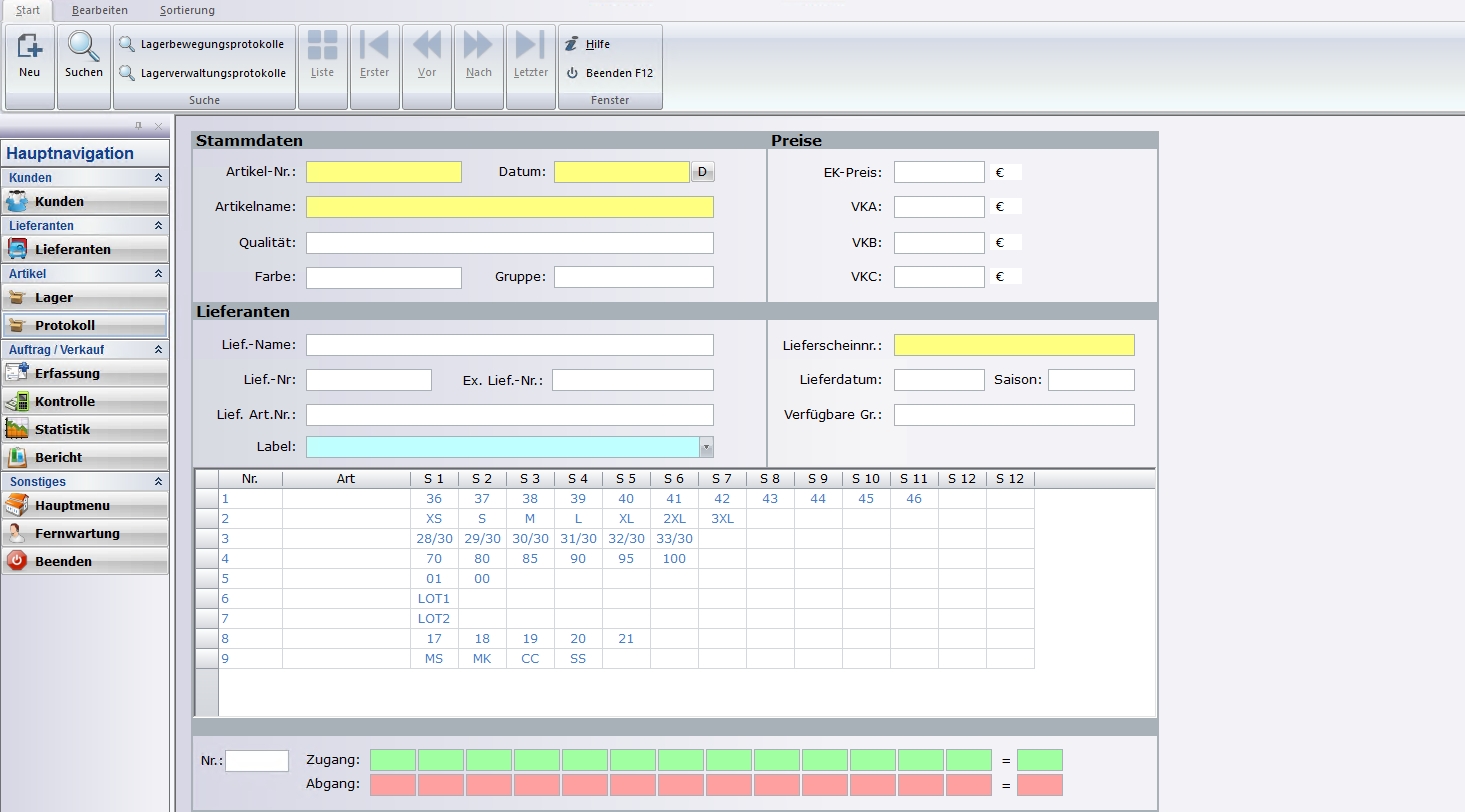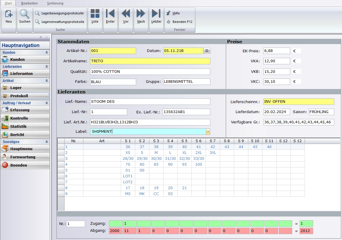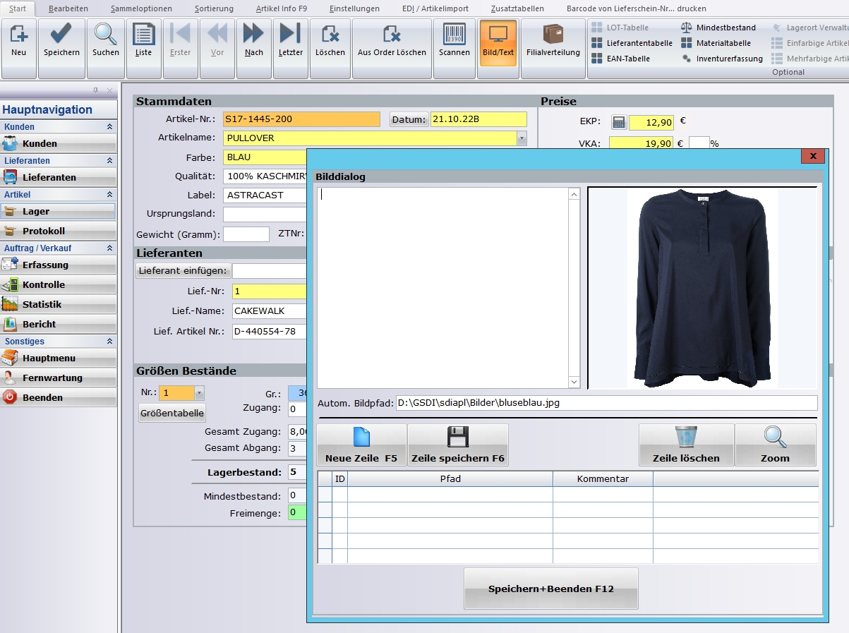 Die Lagerverwaltung unterstützt Sie perfekt und leistungsstark und bietet Auskunft darüber, was Sie in welcher Menge auf Lager haben. Die Artikel werden stückgenau nach Warengruppen, Lieferanten, Größen, Filialen, etc. Barcodeetiketten, Lager-, Inventur-, Bestands- und Zugangslisten und vieles mehr stellt MP PROFI automatisch zusammen. Jeder Artikel kann mit ein Bild und Kommentar versehen werden.