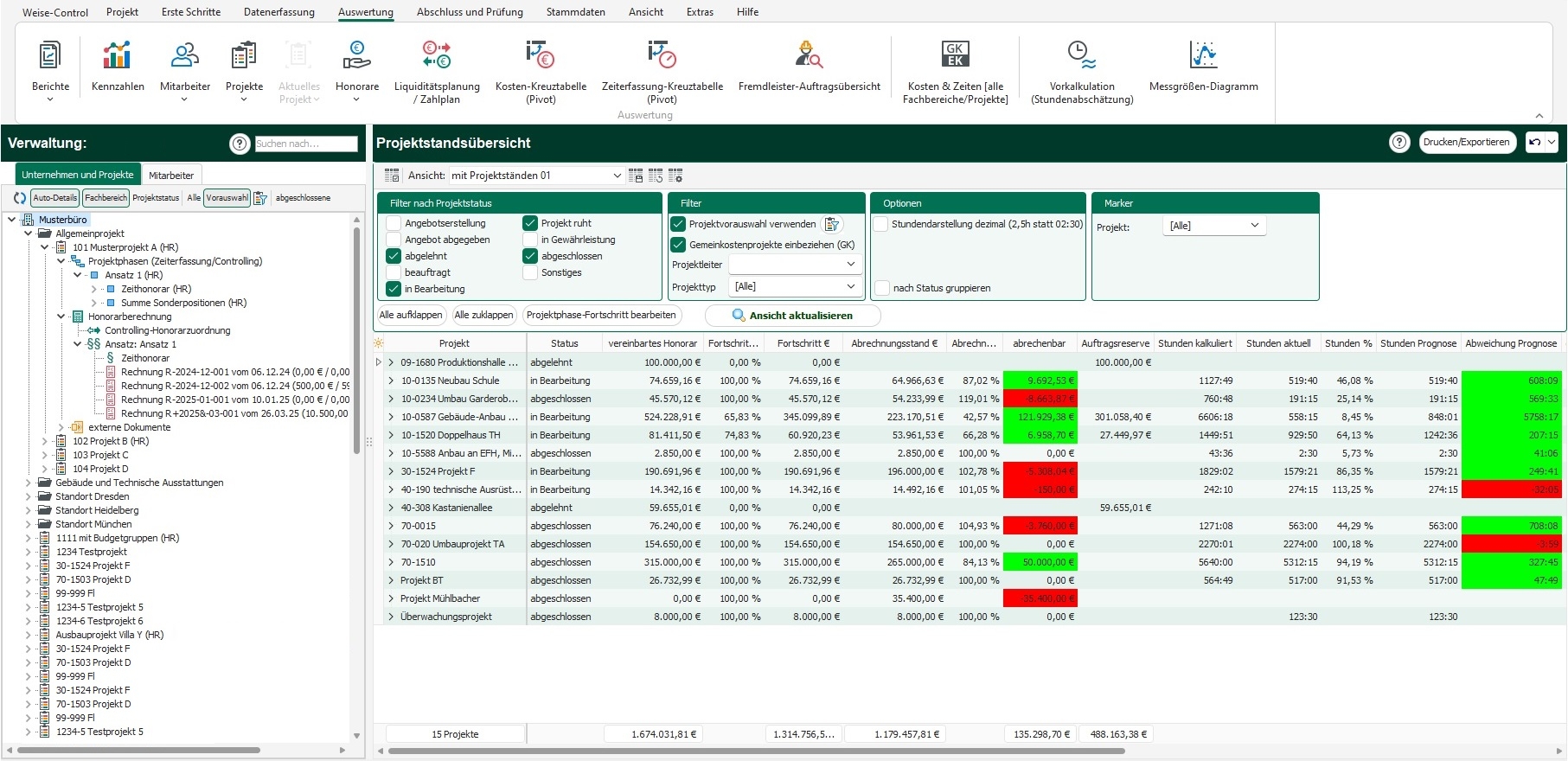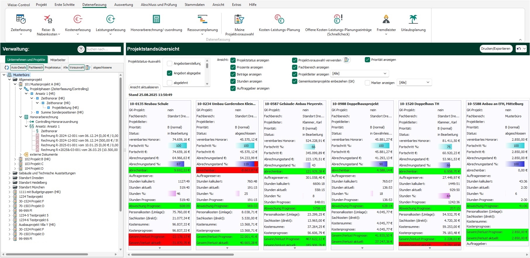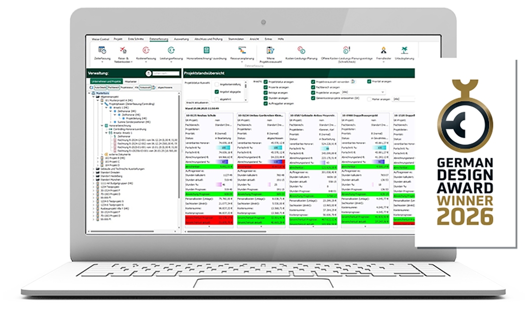 Den Erfolg einzelner Projekte als auch des Gesamtunternehmens zu prüfen, wird sowohl bei Architekten als auch bei Ingenieuren und in Planungsbüros immer wichtiger. Weise-Control 2025 ist eine nach dem PeP-7-Standard zertifizierte Büro- und Management-Software speziell für Planungsbüros (BMSP) und unterstützt genau dabei: Projekte und administrative Aufgaben zu bearbeiten, zu steuern und zu dokumentieren. Daneben hilft sie auch bei der Honorarberechnung nach HOAI.