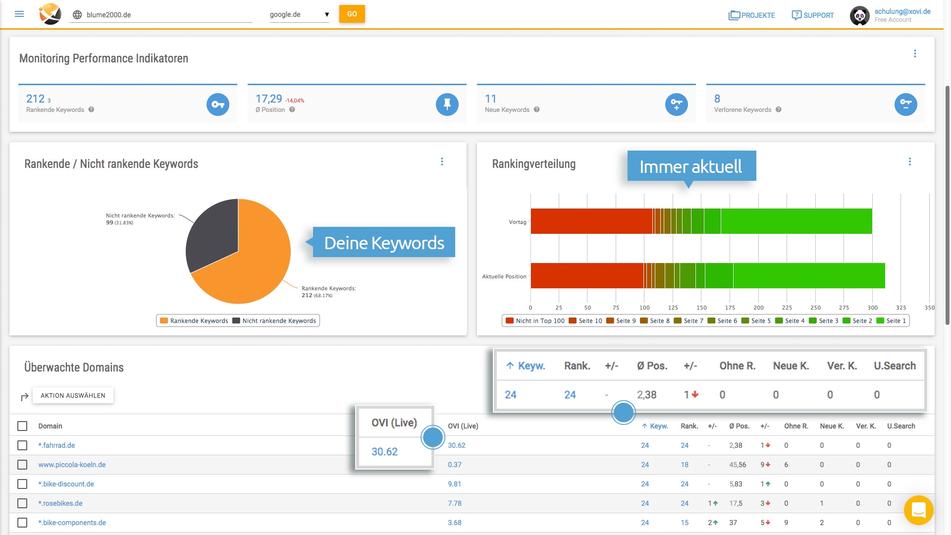 OVI-Monitoring: Der XOVI Online Value Index bietet einen umfassenden Überblick über die Sichtbarkeit Ihrer Domain im Wettbewerbsumfeld.