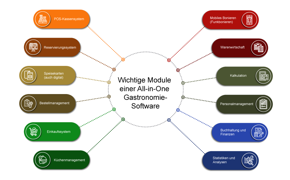 Umfassende Gastronomie bzw. Restaurant Software, die mehrere oder alle oben genannten Bereiche in einer integrierten Lösung abdecken. Diese sind besonders für größere Betriebe oder Ketten geeignet, die eine zentralisierte Verwaltung aller Prozesse anstreben. Die Wahl der passenden Software hängt von der Größe und den spezifischen Bedürfnissen des jeweiligen Gastronomiebetriebs ab. Moderne Lösungen sind oft modular aufgebaut und können in der Regel flexibel an die individuellen Anforderungen angepasst werden.
