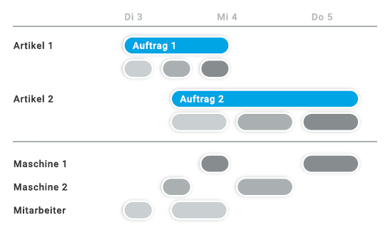 Um Engpässe in komplexen Prozessen lösen zu können, müssen sie zunächst gefunden werden. Ein digitales Abbild der Produktion ermöglicht einen detaillierten Blick auf die Planung. Mit Hilfe eines Gantt-Diagramms wird transparent dargestellt, wo sich Aufgaben häufen, Lücken zeigen oder Termine verletzt werden.